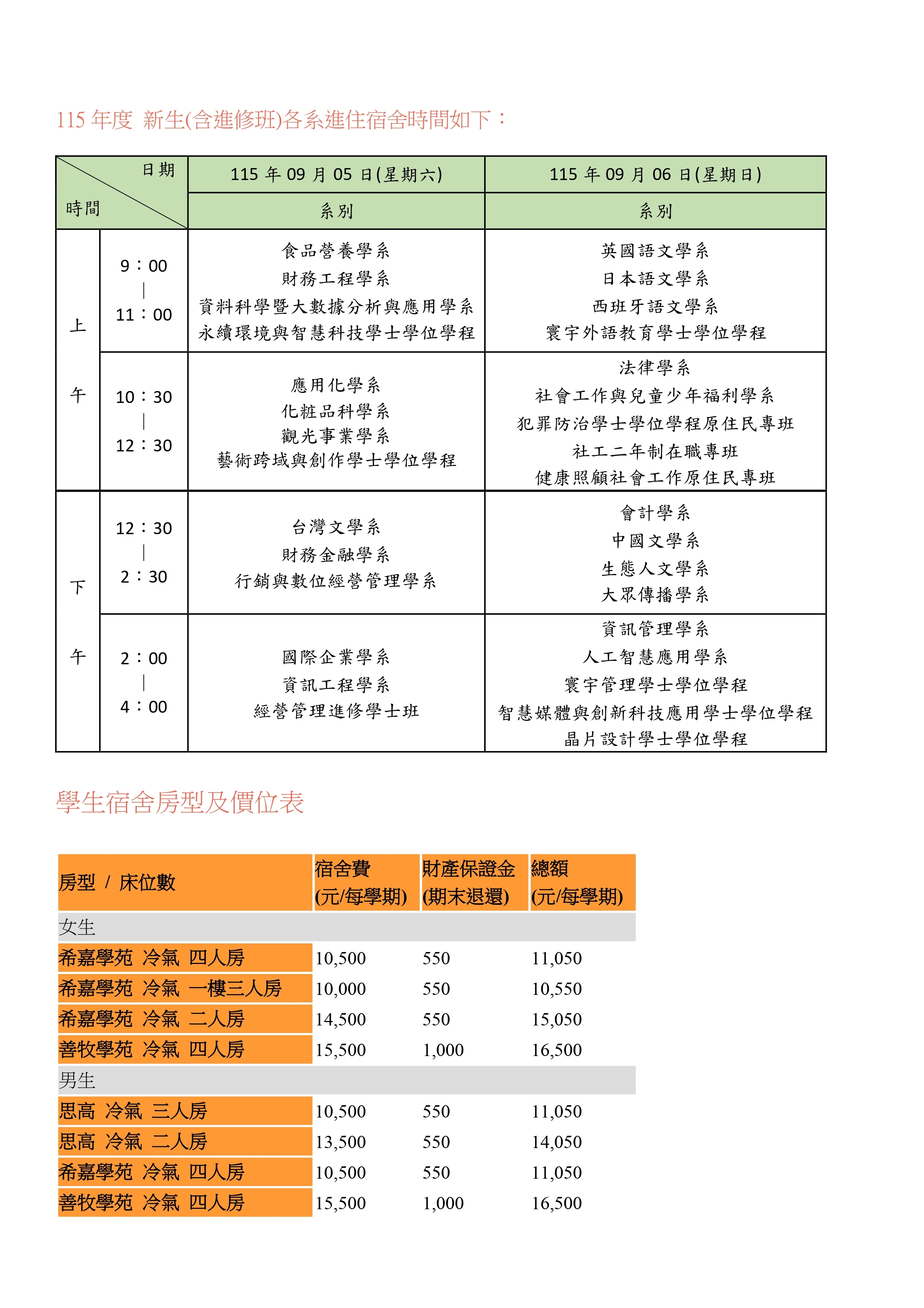 ※希嘉學苑、思高學苑兩人房為特殊房型,以身心障礙同學優先安排入住。